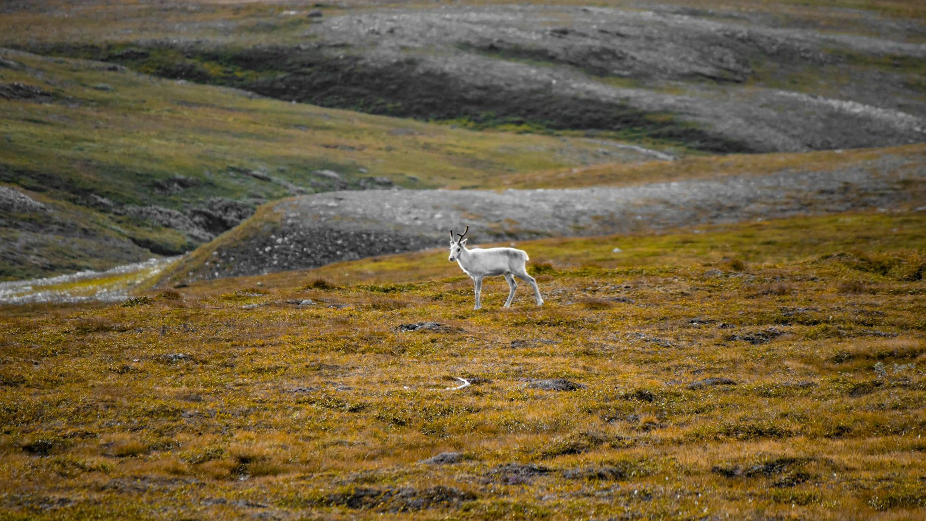 A lone deer stands in a vast autumn tundra landscape, showcasing serene wilderne