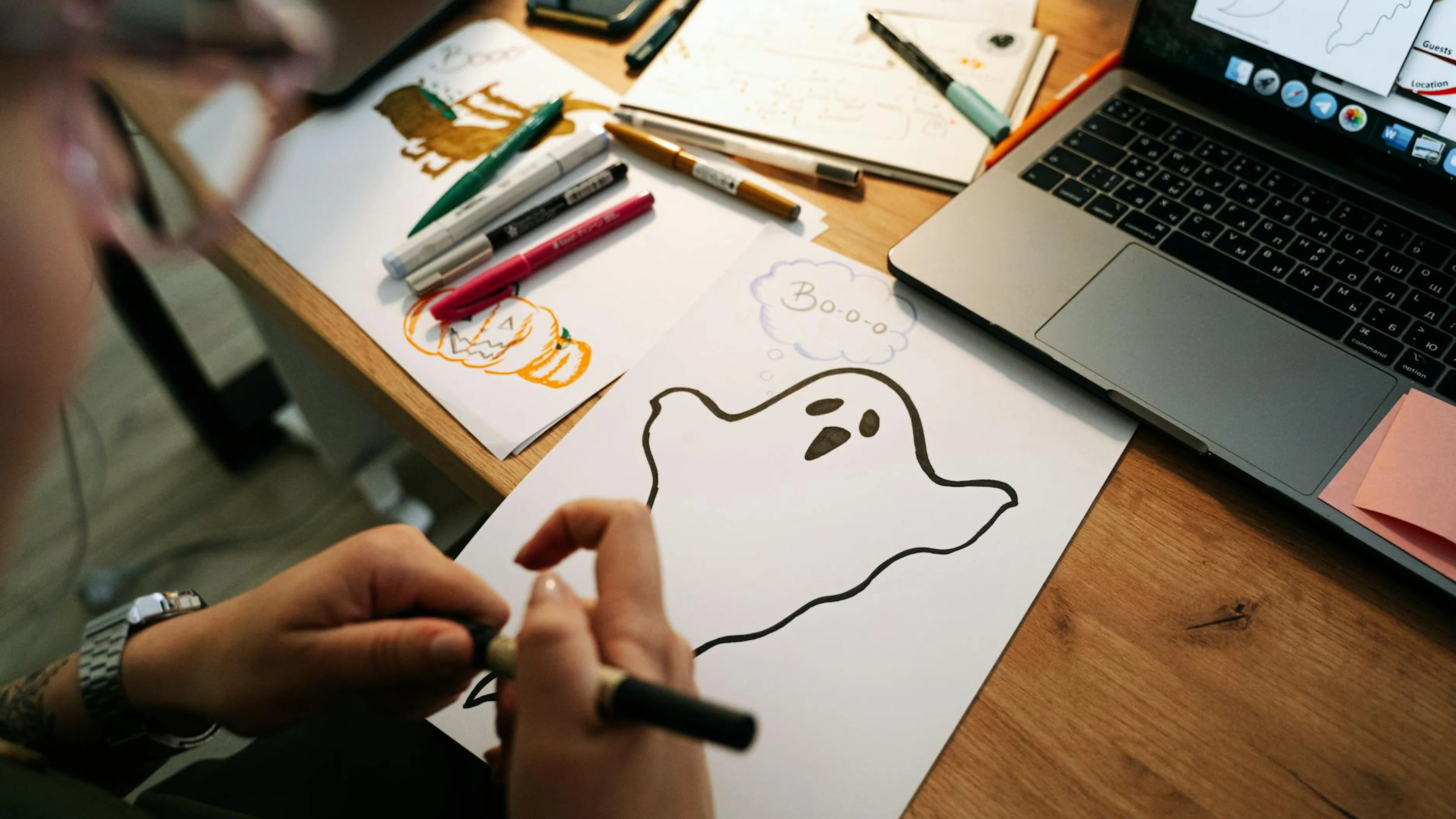 A person drawing Halloween-themed ghosts and pumpkins on paper at a desk with a