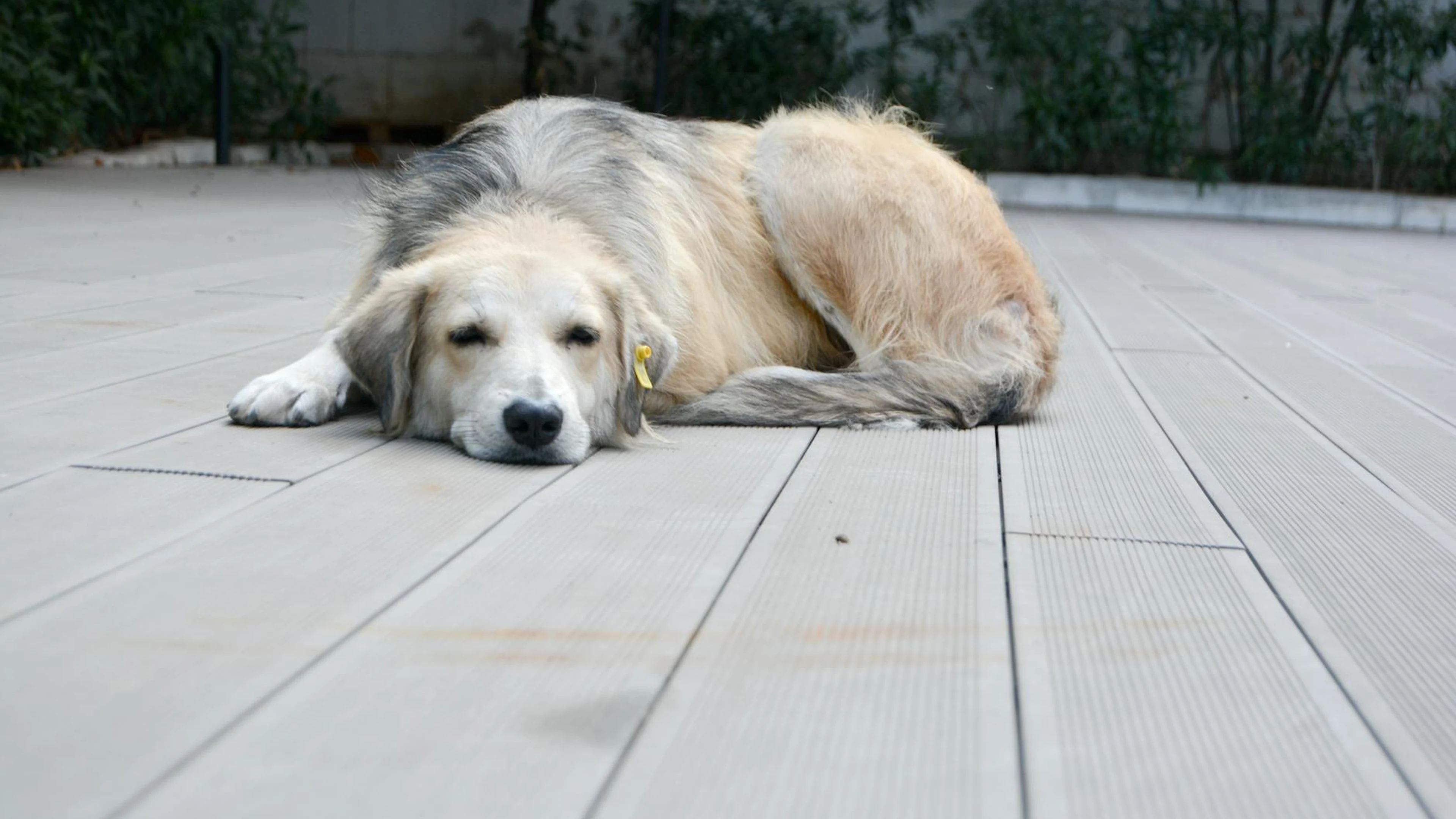 A serene golden retriever sleeps on a wooden deck in a quiet outdoor area, showc