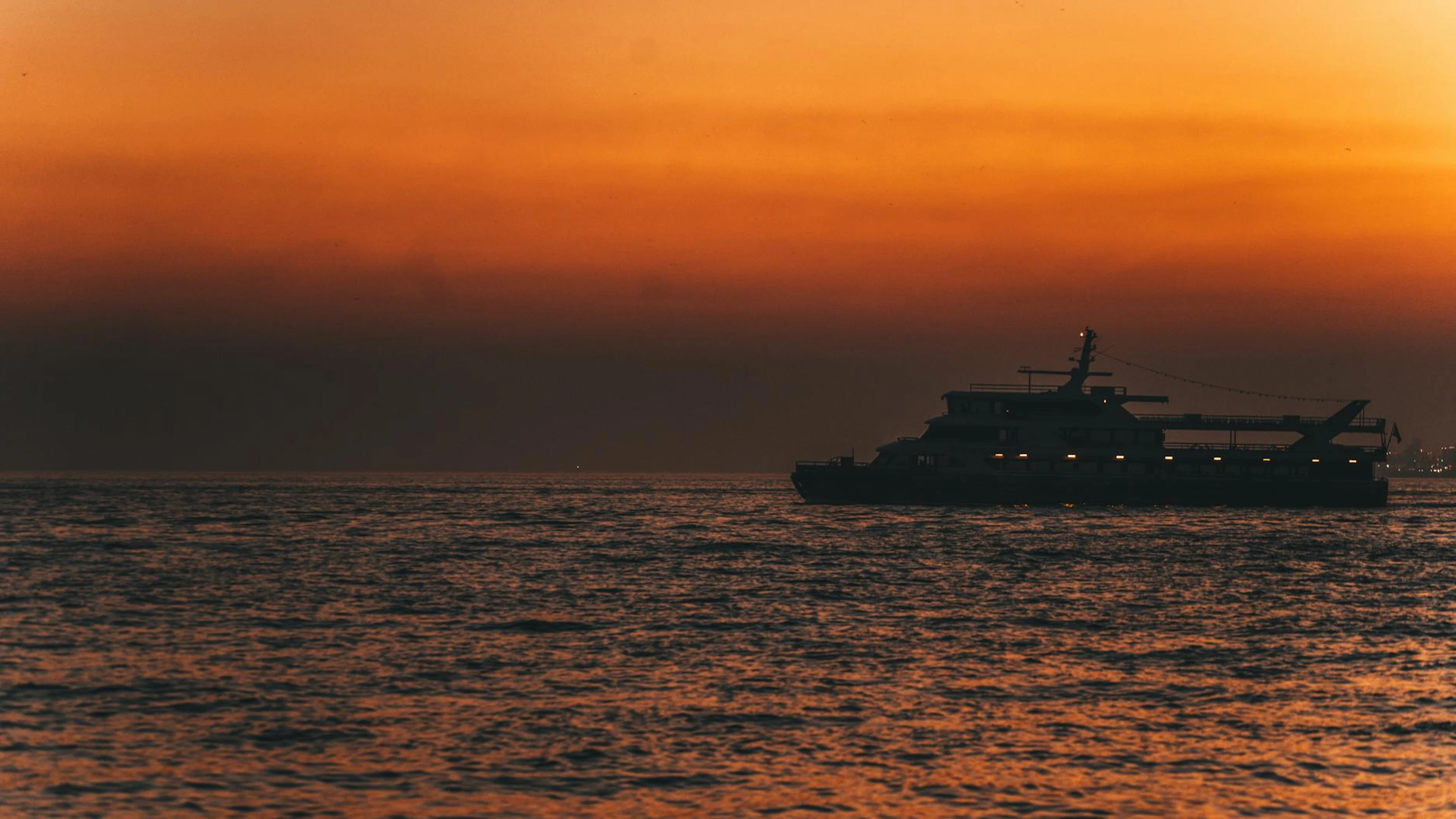 Download A tranquil sunset over İstanbul's coast, highlighting a silhouetted ship against wallpaper for free. 3840x2160 4K Ultra HD resolution, perfect for your desktop. High quality sunset wallpaper.