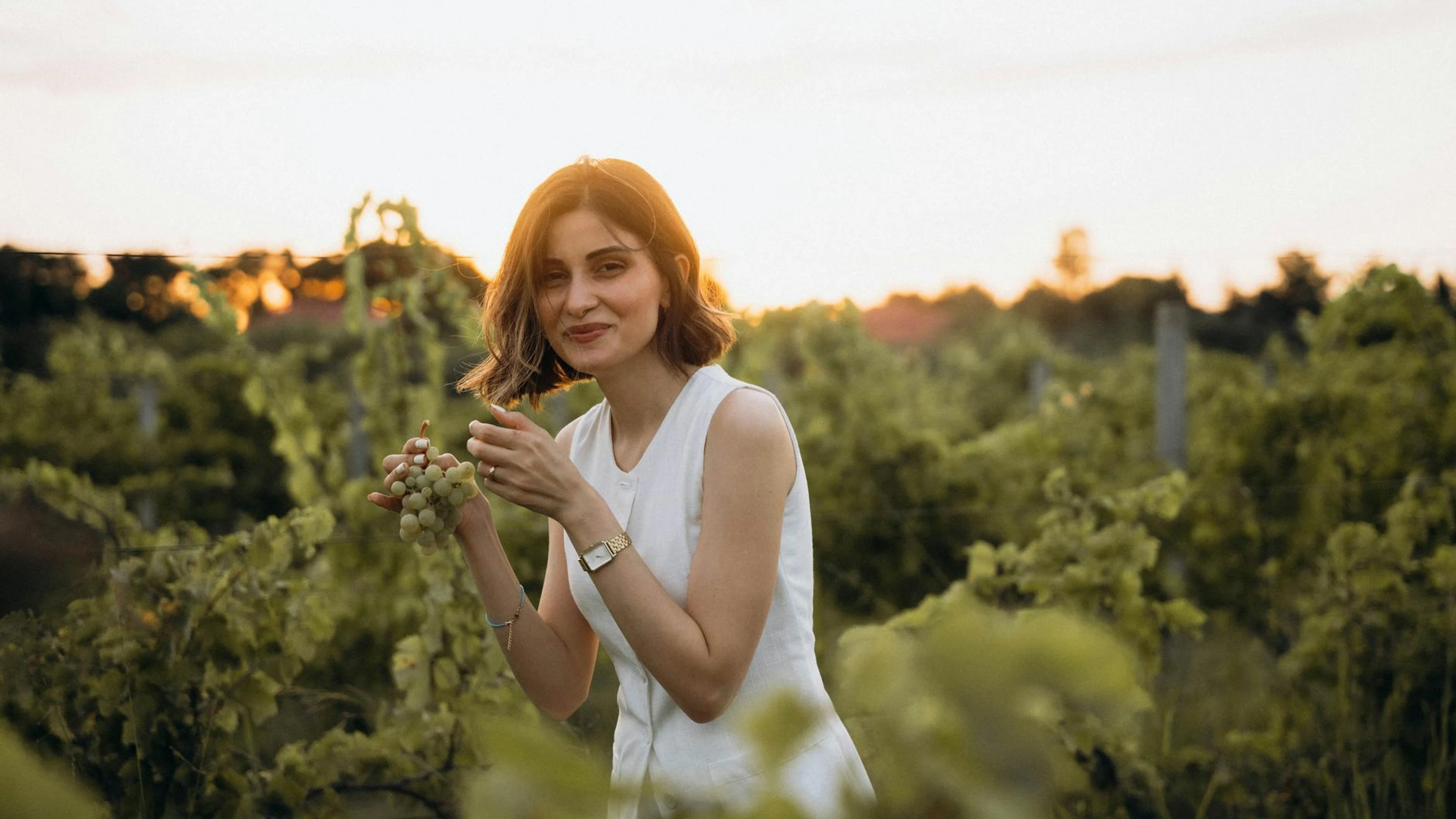 A woman in a vineyard at sunset enjoying fresh grapes and smiling warmly. - free 4K Ultra HD sunset wallpaper for desktop