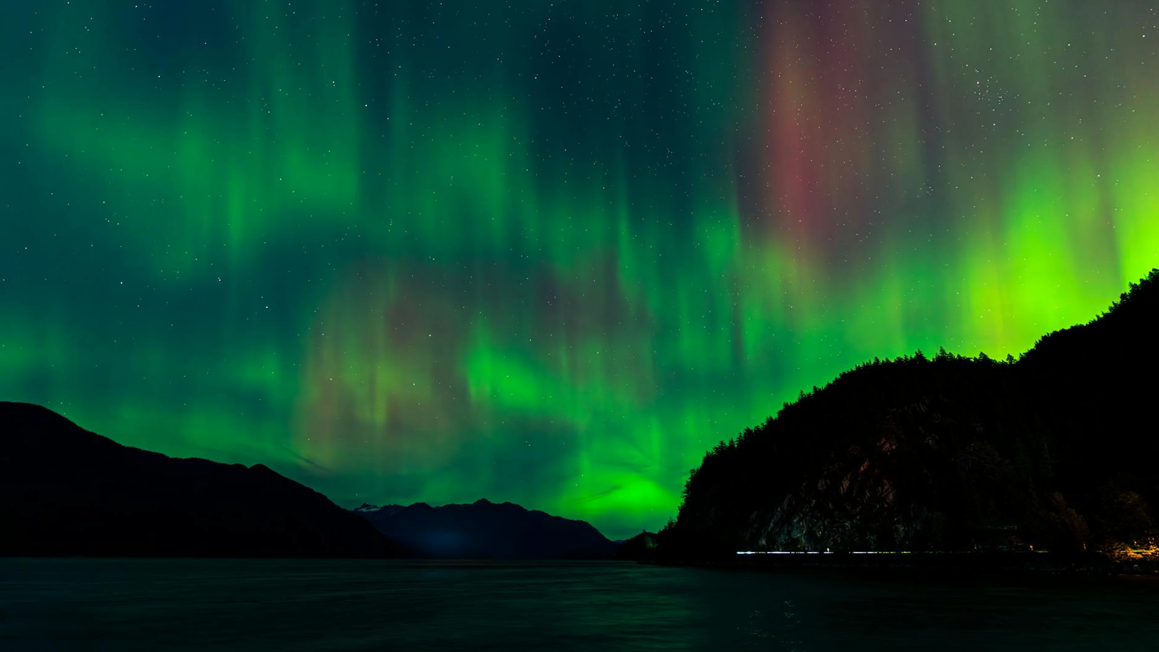 Breathtaking view of Northern Lights dancing over mountains and water. - free 4K Ultra HD aurora wallpaper for desktop