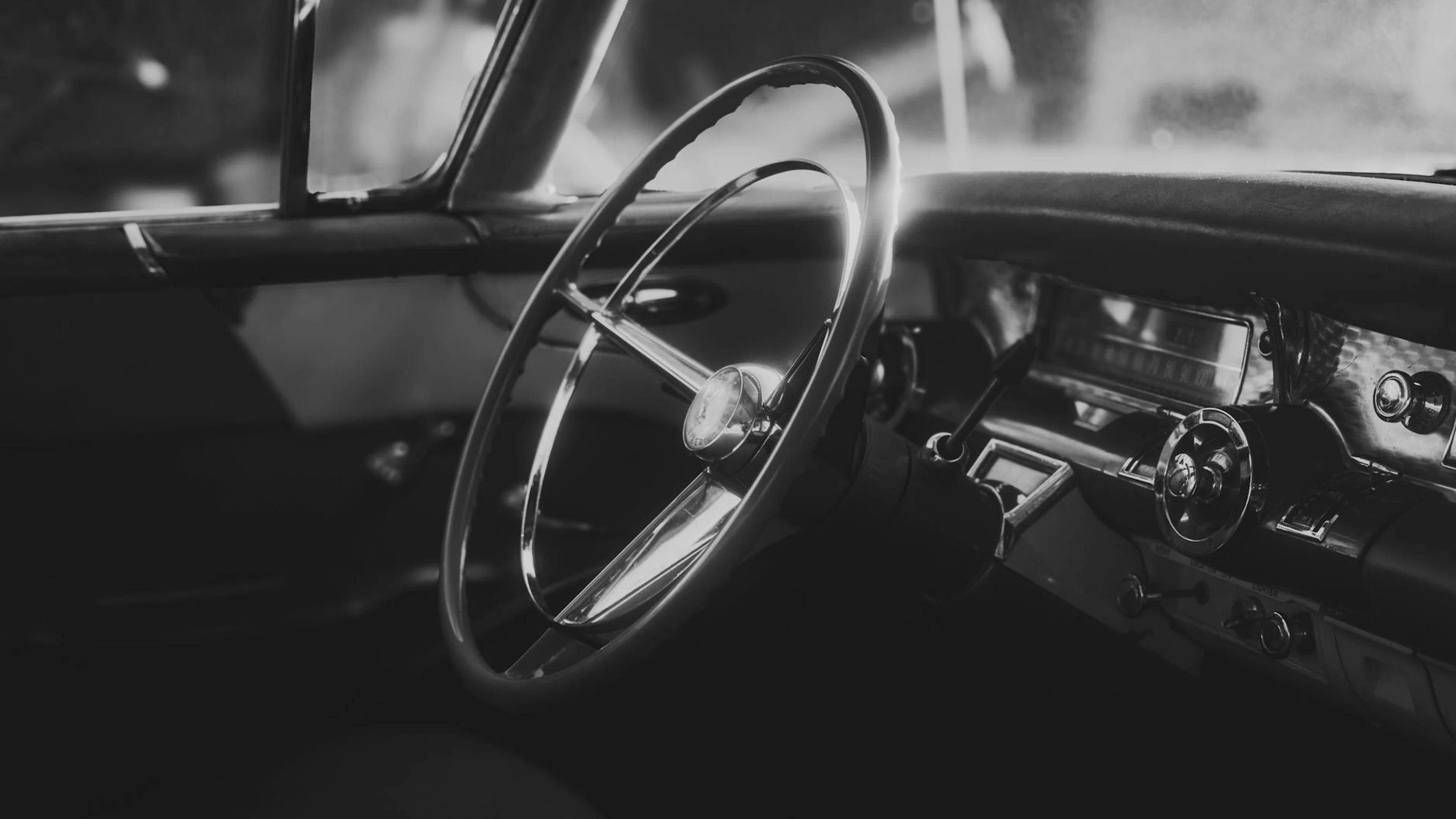 Download Elegant black and white interior of a classic vintage car showcasing timeless de wallpaper for free. 3840x2160 4K Ultra HD resolution, perfect for your desktop. High quality aesthetic wallpaper.