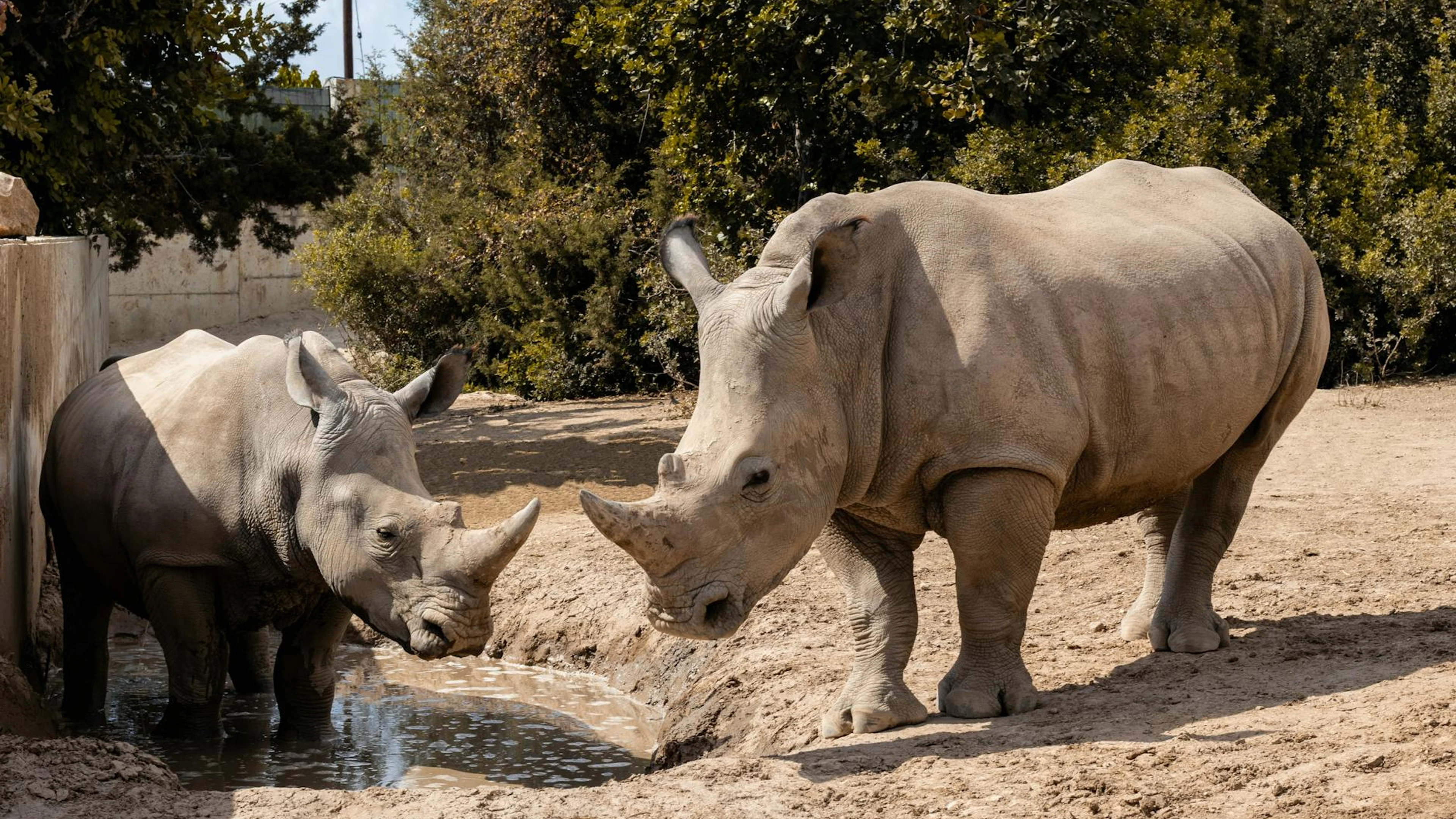 Two rhinos enjoying a sunny day in their natural habitat, surrounded by greenery - free 4K Ultra HD animals wallpaper for desktop